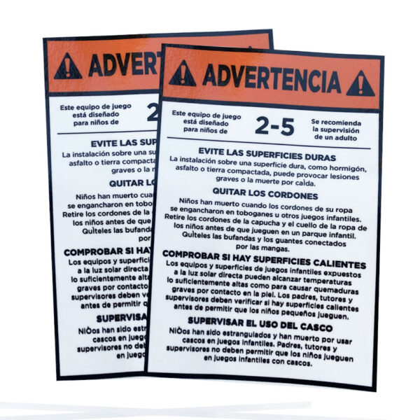 These playground age warning stickers (ages 2-5) are sold by the sheet. Each sheet contains 4 stickers (3.5 x 5 inches per sticker). Stickers are available in both English and Spanish
